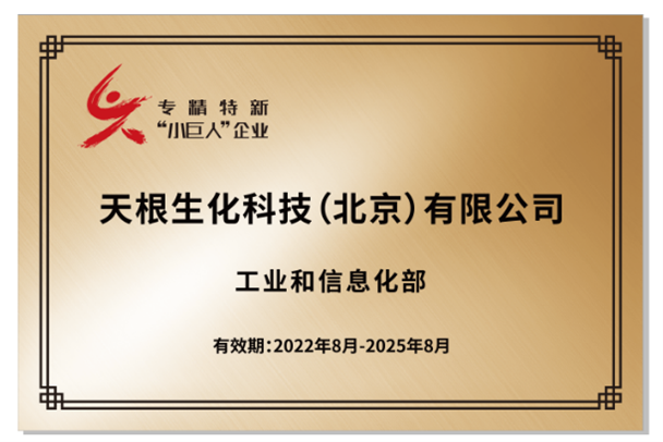 荣耀体育网页版(以下简称“天根生化”)入选国家级专精特新“小巨人”企业,已收到工业和信息化部颁发的国家级《专精特新“小巨人”企业》证书,有效期自2022年8月至2025年8月止。
