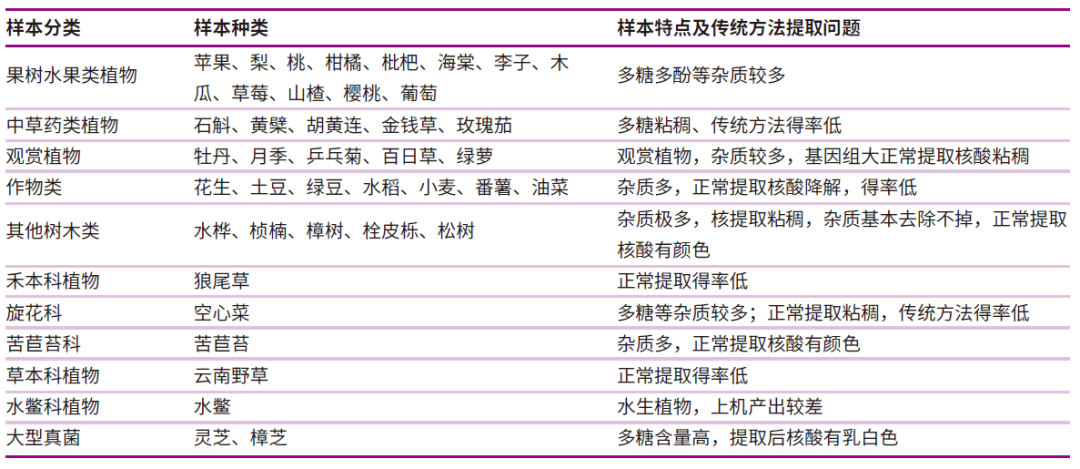 适用于多糖多酚植物、大型真菌等样本类型,提取的核酸完整性更好,可以提取约48kb的基因组DNA,已成功提取数十种植物样本并应用于三代测序。