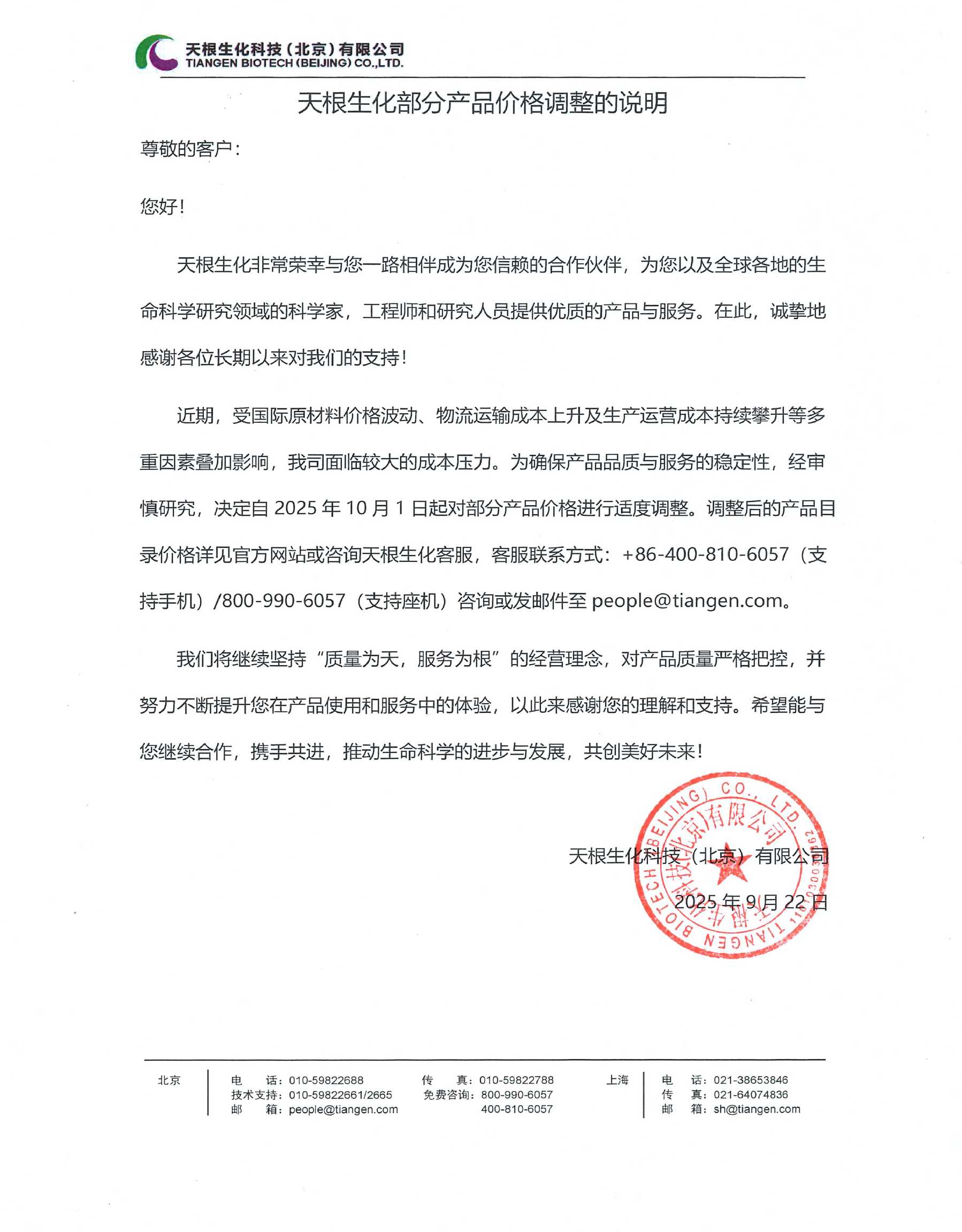 天根生化部分产品价格调整的说明