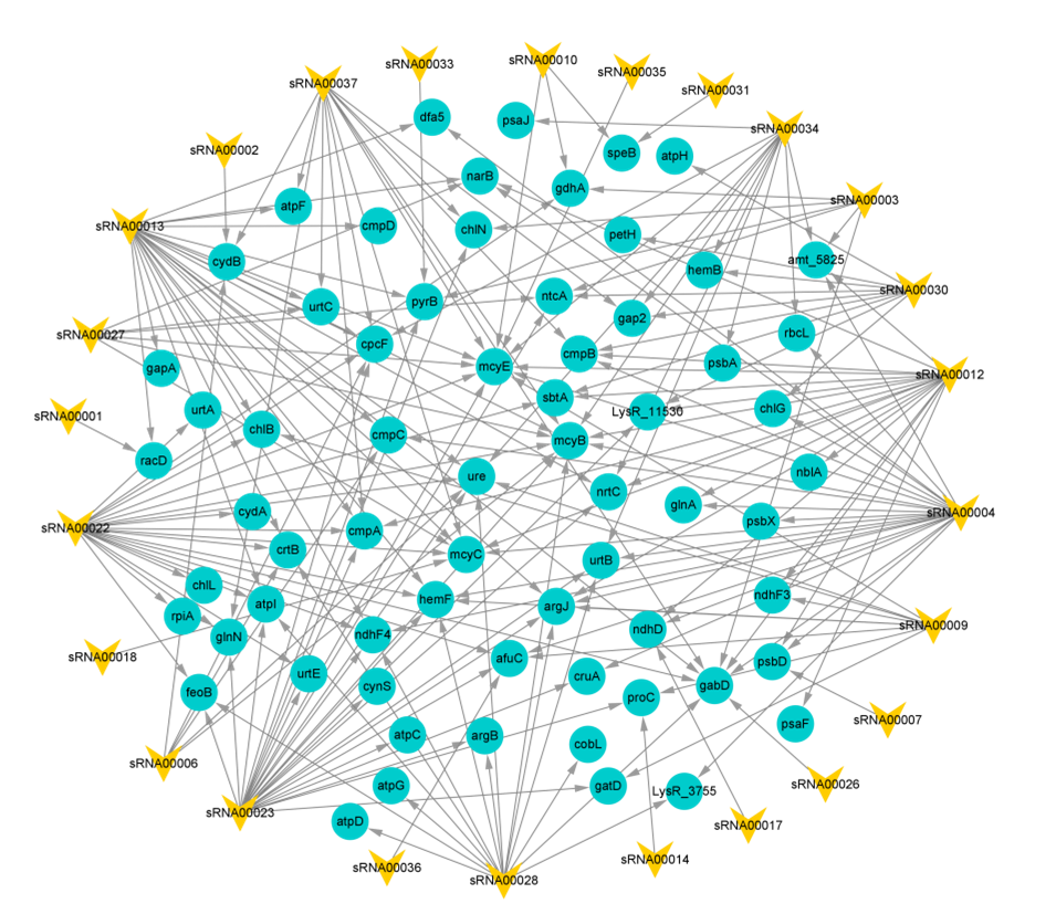 对sRNA进行靶基因预测,并构建互作用网络。在4个sRNA(sRNA0004、sRNA0013、sRNA0022、sRNA0023)的目标中,超过20个。这些靶点涉及多种代谢途径,如氮的运输和储存、光合器官的组装、MC的产生、CO2的固定。这些发现为进一步的研究奠定了坚实的基础,这将为蓝藻如何利用sRNAs整合多种调节途径以响应营养变化提供新的线索。