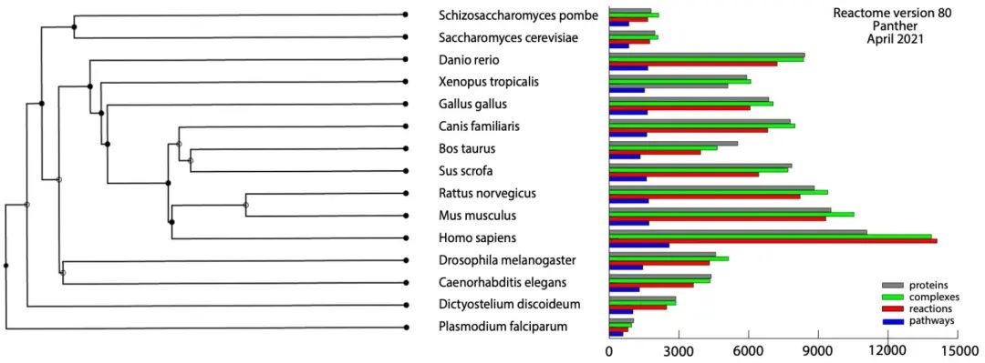 截至2021年4月发表的V80版本,Reactome数据库现收录了包括人在内的16个物种的数据(如上图所示,Mycobacterium tuberculosis未在列),其中包括14,108个人类反应,2,580个通路,涉及11,084个蛋白质,13,869个复合物,1,987个小分子和532种药物。这些注释得到了34,703篇文献的支持。Reactome将这些反应映射到 77,392 种直系同源蛋白上,在 15 个非人物种中创造了 18,830 条直系同源通路。V80 包含 5,422 种蛋白质变体(突变蛋白质)及其翻译后修饰形式的注释,这些蛋白质衍生自 352 种蛋白质,已用于注释疾病特异性的 1,601 种反应和 695 种途径。