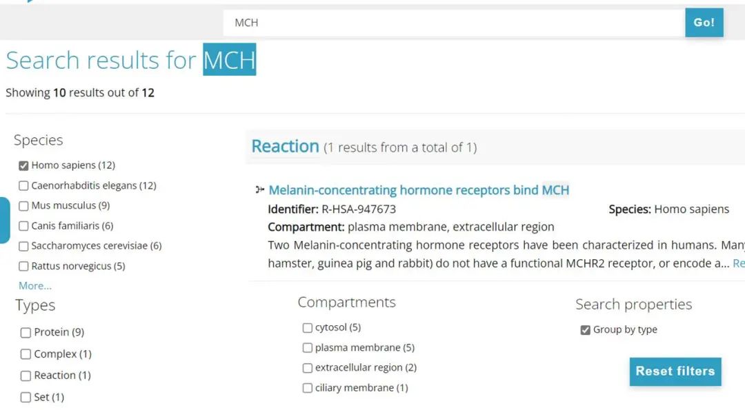 可在首页搜索框中输入感兴趣的基因、蛋白、复合物、通路等关键词进行检索。可按自己关注的物种,分子类型等进行筛选。点击感兴趣的分子可直接查看其所在通路等信息。