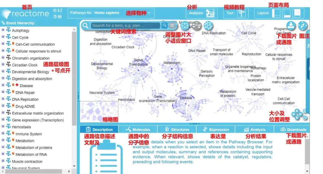 在首页点击Pathway Browser进行通路检索。Reactome数据库更加的简洁,它将所有的通路进行整合,绘制出了烟花状的有向无环总览图。每个通路均添加了链接,点击可查看相关通路和具体信息。页面布局如下图。