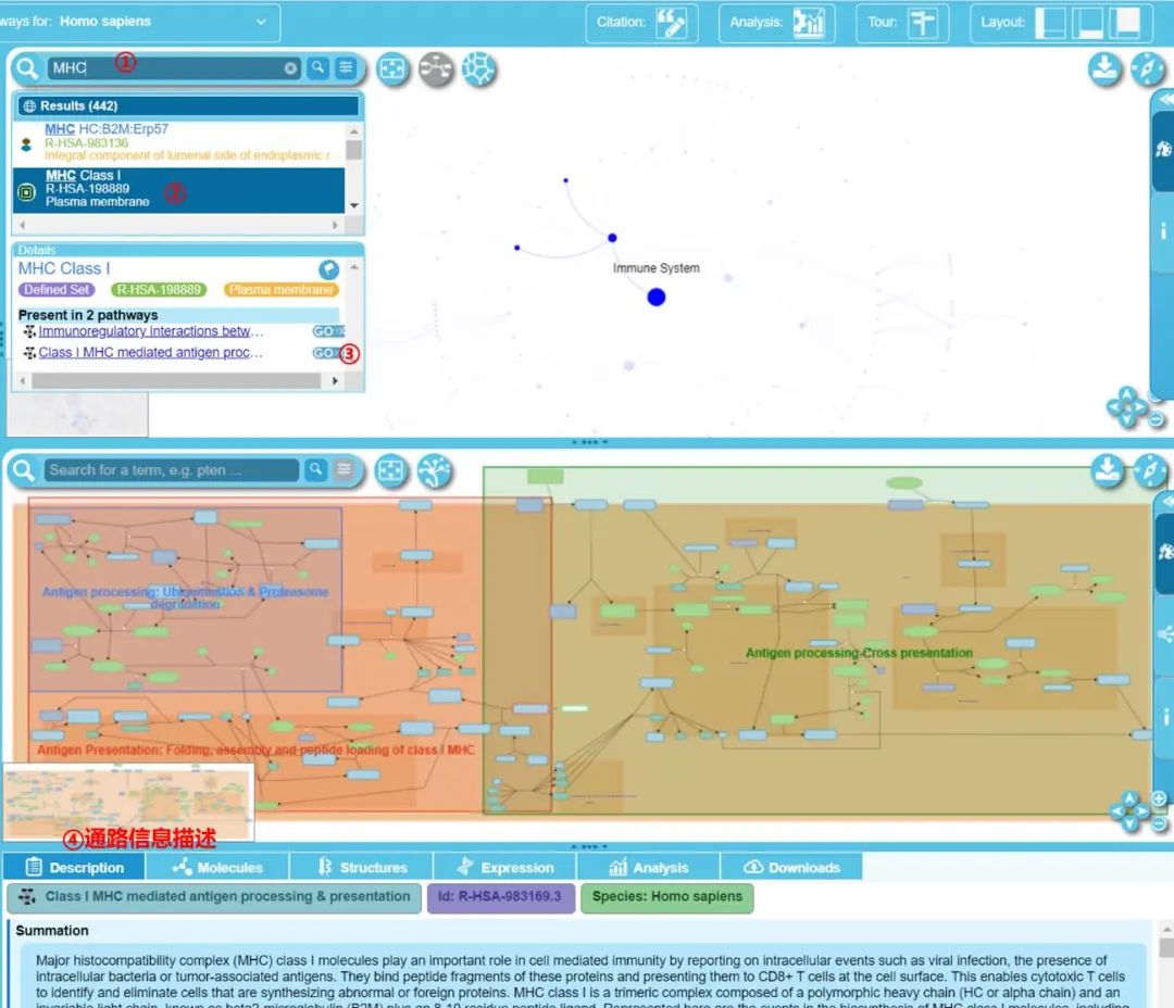 在搜索框输入感兴趣的分子名称“MHC”,选择“MHC Class I”,可以看到这个基因集在2个通路中,点击感兴趣的通路“Class I MHC mediated antigen processing & presentation”可详细展示(如下图)。在“Description”可以看到通路详细的描述、其它数据库中相关信息及参考文献。