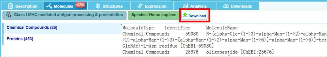 在“Molecules”可以看到通路中有哪些分子,点击“Download”可下载分子列表。