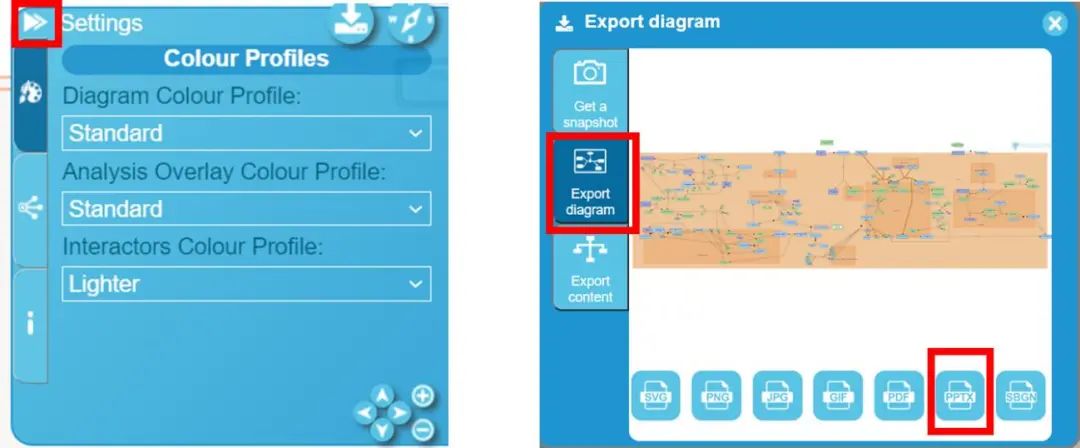 点击右侧的双箭头导出设置页面,可以对通路的背景颜色、显示的信息进行设置。点击“Downloads”进行通路图片和通路数据的下载。