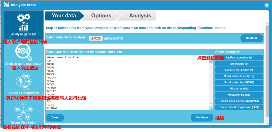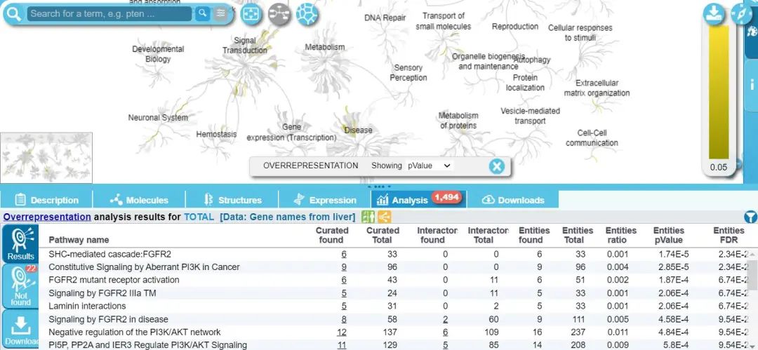 当我们从公司得到高通量分析的初步结果后,可以根据一定的条件找到一些关心的基因(比如差异显著的top20的基因),这时可以通过该模块进行深入的分析。以“Analyse gene list”分析为例,输入测试数据之后,可以得到通路富集的结果,可选择pValue或FDR小于0.05的进行可视化展示。