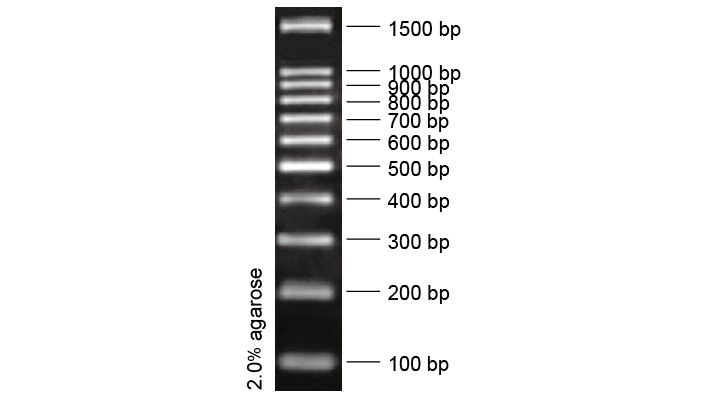 100 bp DNA Ladder 是由单独制备的PCR 产物混合而成,共有11 条DNA 片段,已加入上样缓冲液,可直接电泳,每次上样 6